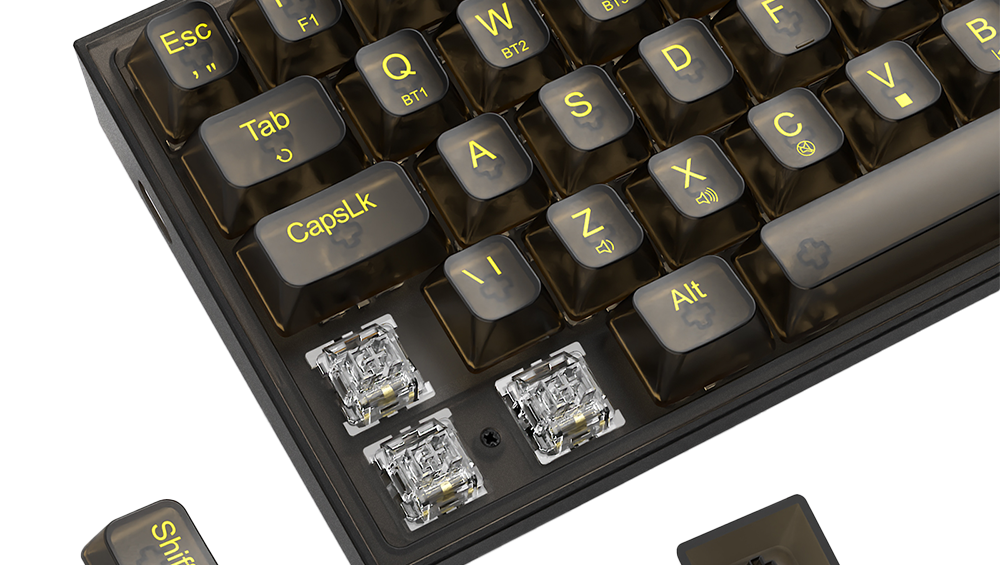 As teclas são fabricadas por meio de um processo de injeção que combina duas camadas de plástico, formando uma estrutura robusta e legendas duráveis que não se desgastam com o tempo